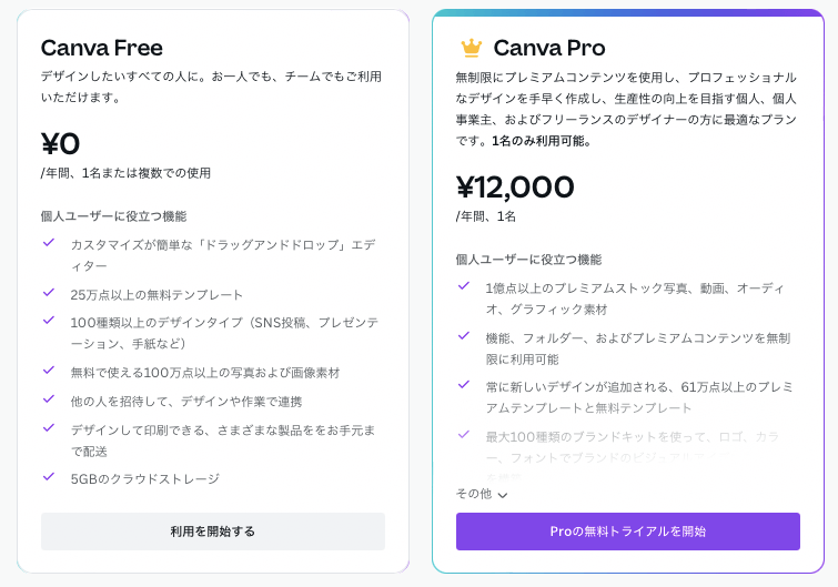 Canvaは基本的に無料でも十分な機能が利用できますが、Canva Proという有料プランもあり利用できるテンプレートの数やストレージ容量などが変わってきます。