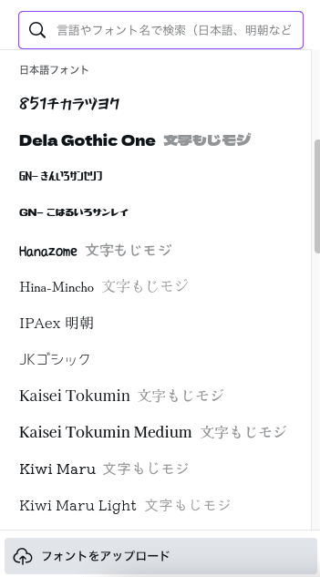 ご自身のお気に入りのフォントをアップロードすることができます。また一部有料なフォントもあるので素材や写真同様、気にせず利用できるのもよいところ。