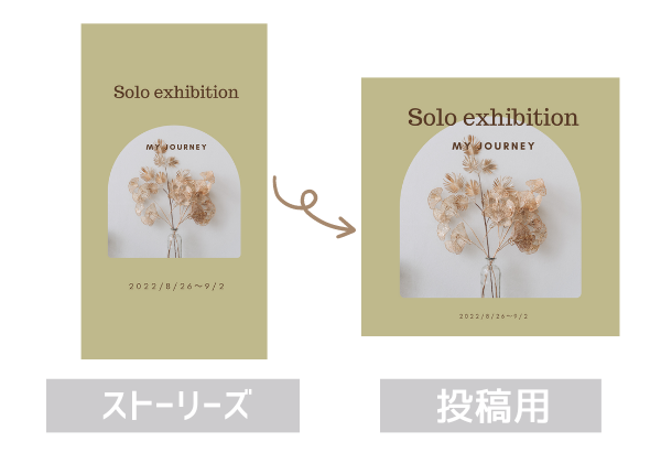 デザインしたストーリーズ用の画像を → 投稿用サイズにリサイズすると上記のように仕上がります。(文字の位置などの微調整は必要)