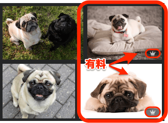 右下に王冠のマークがついている写真は有料。マークのついていない左側の写真は無料です。