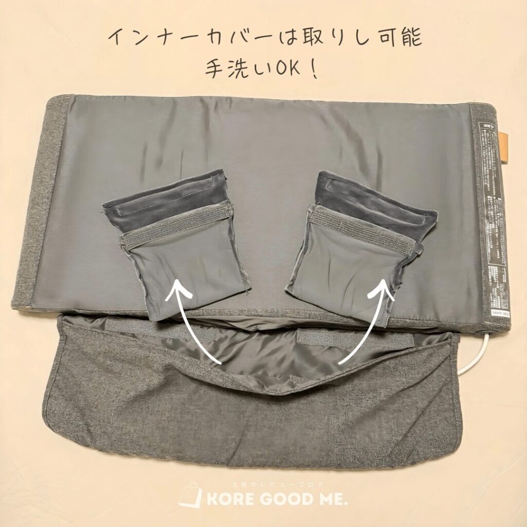 また、足先を入れる部分にはマジックテープで固定されたインナーカバーが付いています。取り外して手洗いができるので衛生面的にも安心!